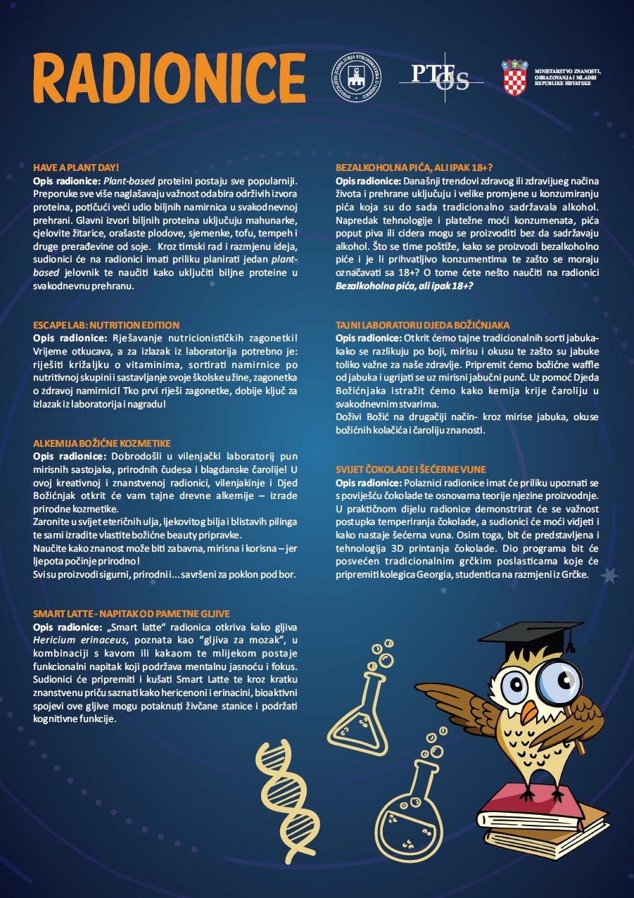 Radionice su oblikovane kako bi popularizirale znanost, potaknule kreativnost i približile područja prehrambene tehnologije, nutricionizma, kemije i bioprocesnog inženjerstva mladima.