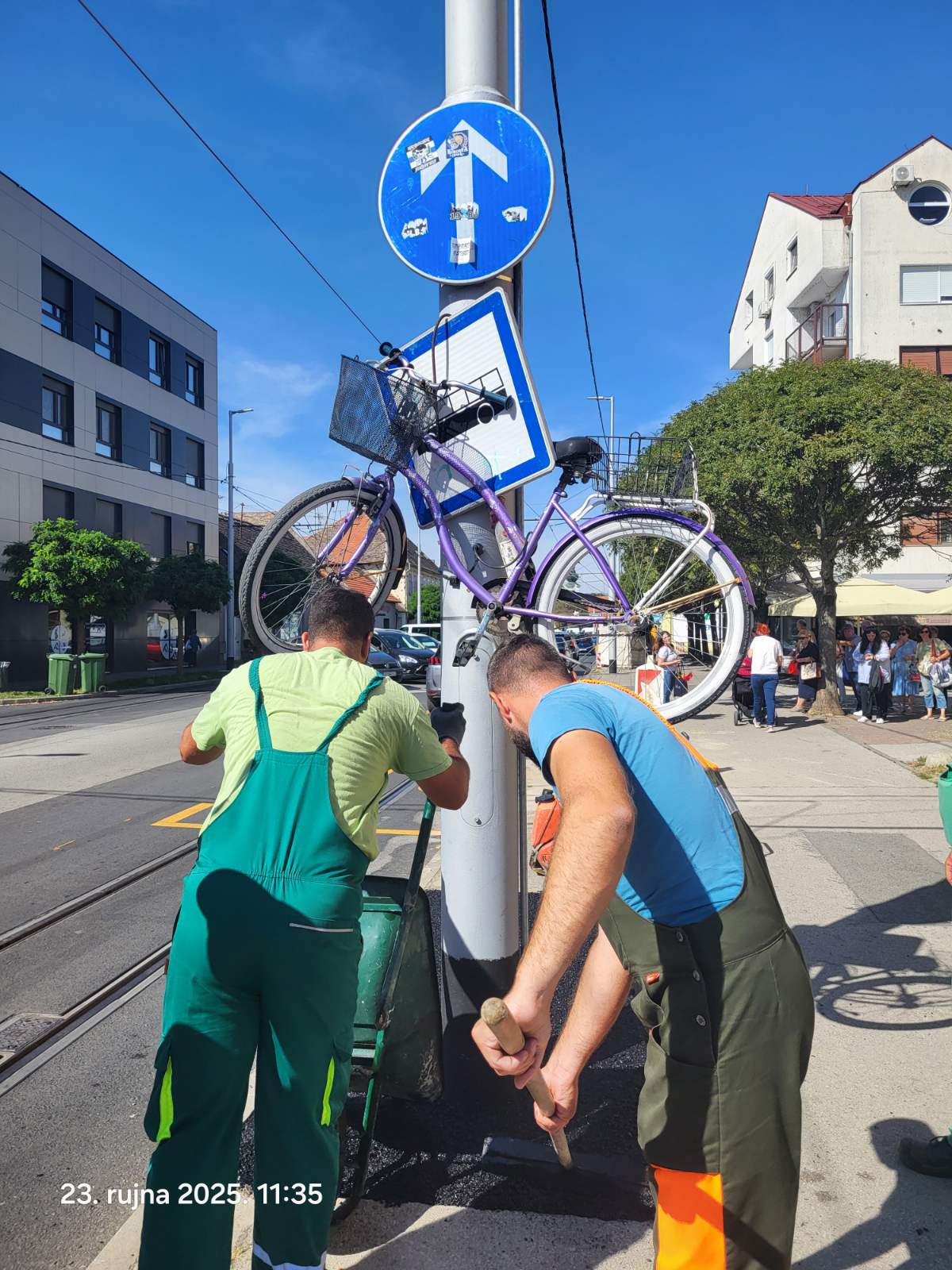 Radnici koji su sanirali kolnik u Strossmayerovoj ulici naišli su na neočekivanu prepreku – ljubičasti bicikl vezan lancem za stup javne rasvjete