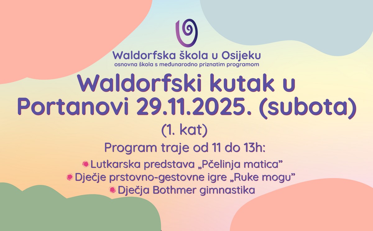 Waldorfski kutak u Portanovi – subota od 11 do 13 sati. Ove subote, 29. studenog, Portanova se pretvara u kreativni prostor ispunjen igrom, pokretom i maštom zahvaljujući Waldorfskom kutku. Riječ je o jedinstvenom iskustvu koje djeci i roditeljima približava waldorfski pristup učenju – nježan, inspirativan i usmjeren na cjeloviti razvoj. Mališani će uživati u lutkarskoj predstavi „Pčelinja matica“, prstovno-gestovnim igrama „Ruke mogu“, kao i u dječjoj Bothmer gimnastici koja potiče koordinaciju, istraživanje i slobodu pokreta.