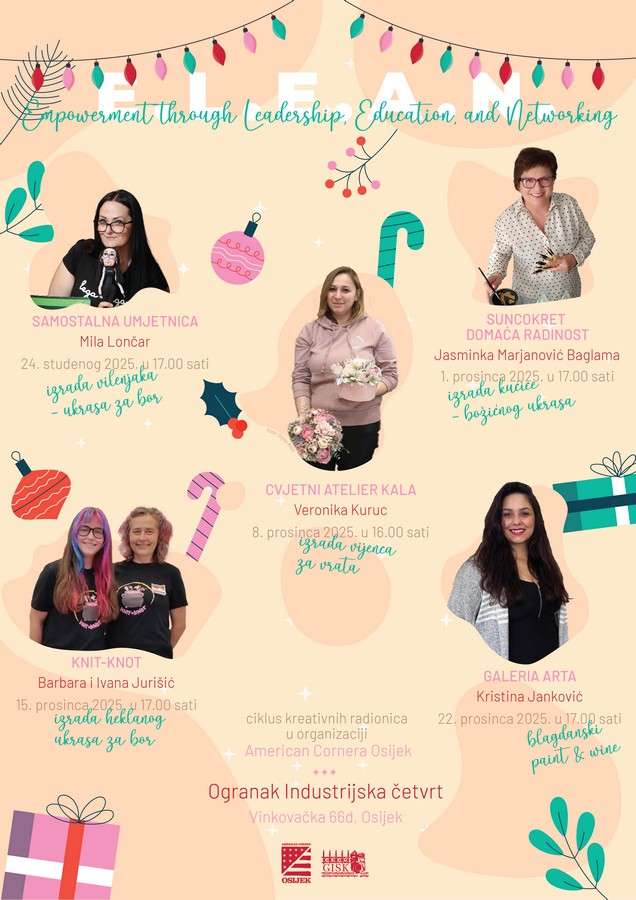American Corner Gradske i sveučilišne knjižnice Osijek provodi program E.L.E.A.N. – Empowerment through Leadership, Education, and Networking. Lokalne će obrtnice provesti reativne radionice kojima će predstaviti svoje proizvode i kreacije, a sudionici će moći naučiti i izraditi nešto novo. U programu sudjeluju samostalna umjetnica Mila Lončar, Jasminka Marjanović Baglama (Suncokret – domaća radinost), Veronika Kuruc (Cvjetni atelier Kala), Barbara i Ivana Jurišić (Knit-Knot) te Kristina Janković (Galeria Arta). Obzirom da se bliži adventsko vrijeme, radionice će biti tematske – na radionici Mile Lončar sudionici će izrađivati ukrase za bor u obliku vilenjaka, na radionici Jasminke Marjanović Baglama božićni ukras u obliku kućice, Veronika Kuruc održat će radionicu izrade vijenca za vrata, Barbara i Ivana Jurišić sudionicima će pomoći u izradi heklanog ukrasa za bor, dok će Kristina Janković održati prigodnu paint&wine radionicu.