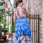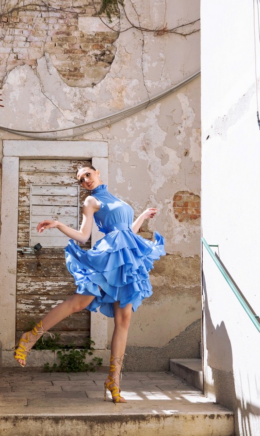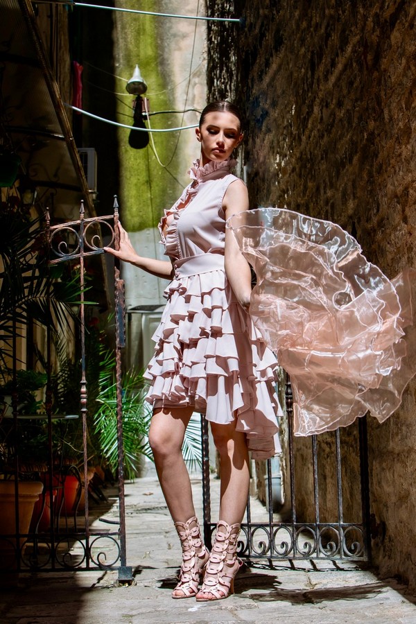 Kolekcija se oblikuje oko ideje ravnoteže između kontrole i oslobađanja. Konstrukcija odjevnih komada naglašava precizno definiranu siluetu: strukturirani gornji dijelovi i istaknuti struk uspostavljaju jasnoću forme, dok slojeviti, kaskadni volani unose pokret, lakoću i osjećaj fluidnosti. Upravo u toj napetosti između arhitektonske discipline i mekoće materijala razvija se prepoznatljiv vizualni identitet kolekcije.