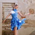 La Transition objedinjuje oba izraza: gornji dio u bež tonu prelazi u plavi donji segment, dok bogato oblikovan ovratnik dodatno naglašava prijelaz, stvarajući vizualno i konceptualno središte kolekcije. Haljina koja priča o promjeni bez prekida, o kontinuitetu koji je sam po sebi najljepši oblik slobode.