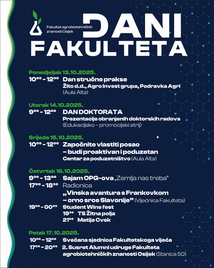 U sklopu proslave, 16. listopada 2025. godine ispred zgrade Fakulteta s početkom u 9:00h organizira se Sajam OPG-ova pod nazivom „Zemlja nas treba“, a u nastavku dana od 19:00 do 00:00 sati Student wine fest na kojem će studenti i ostali posjetitelji uz nastup Matije Cveka i TS Žitna polja moći uživati u dobrim vinima iz našeg kraja.