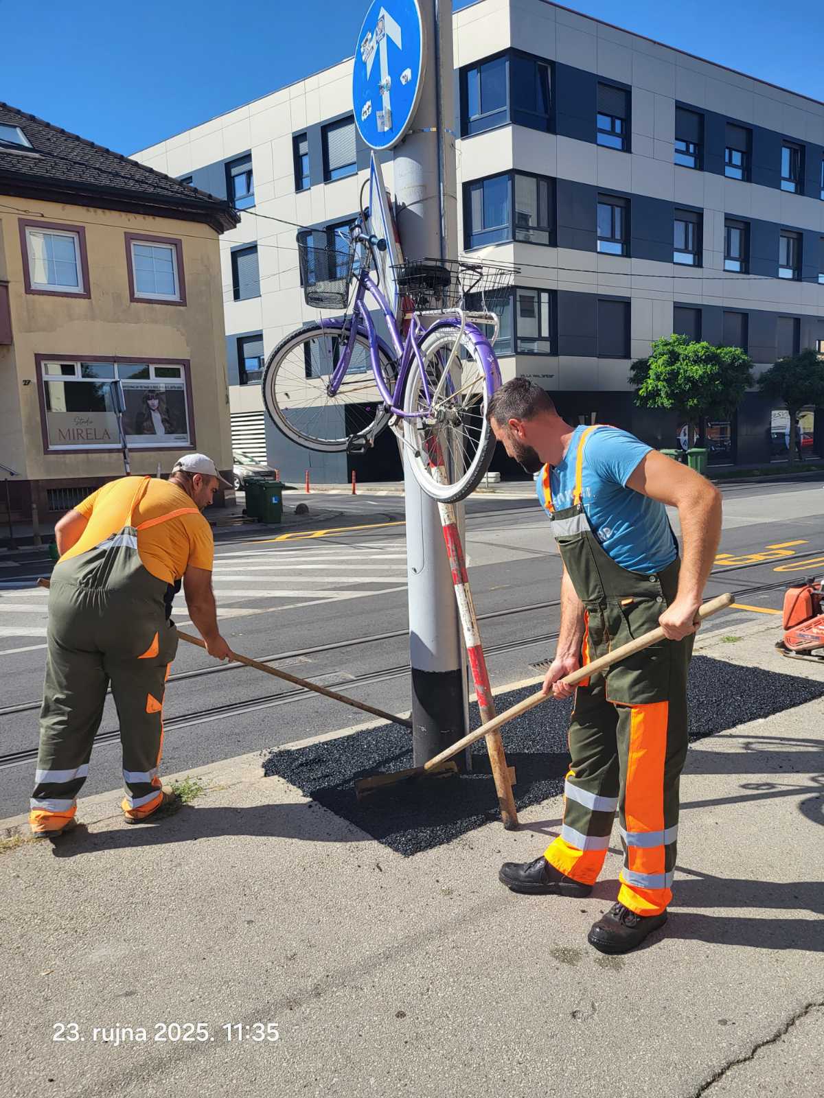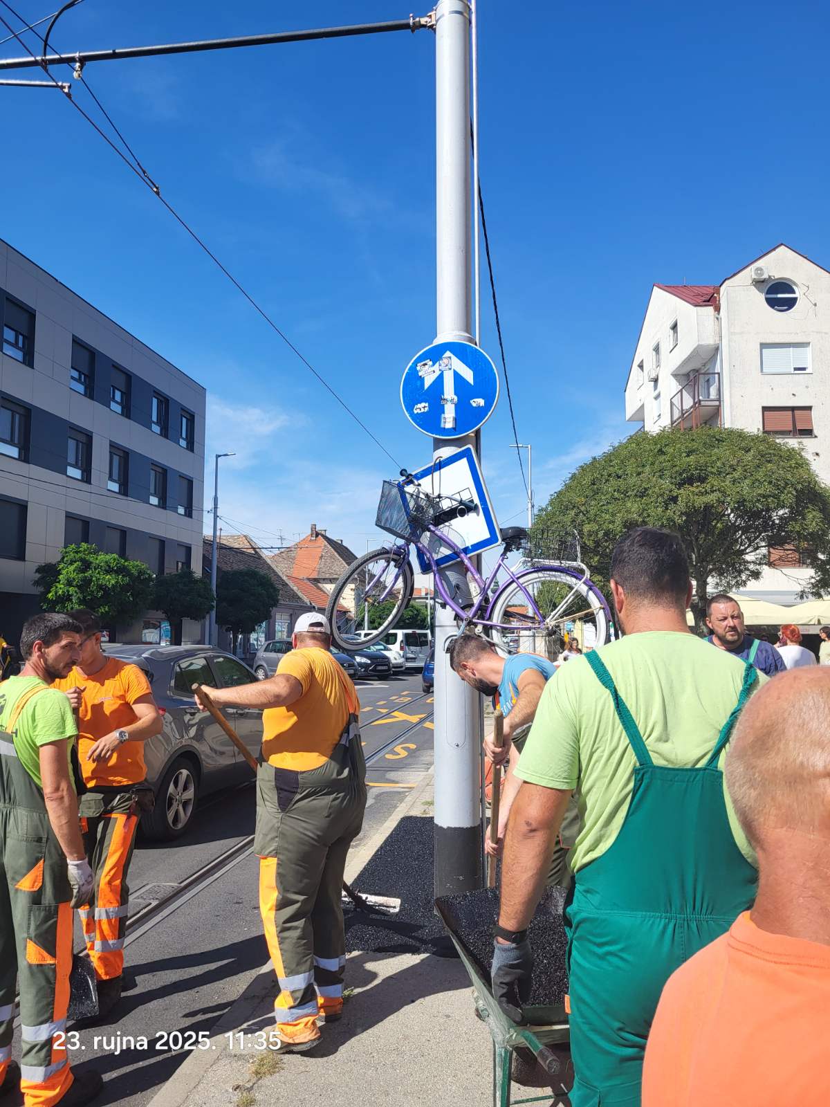 Prema riječima svjedoka, čekali su vlasnika gotovo četiri sata, nadajući se da će se pojaviti i ukloniti bicikl. Budući da nije bilo ni traga ni glasa vlasniku, odlučili su problem riješiti na svoj način: podigli su bicikl nekoliko desetaka centimetara više, dovoljno da im oslobodi prostor za asfaltiranje.