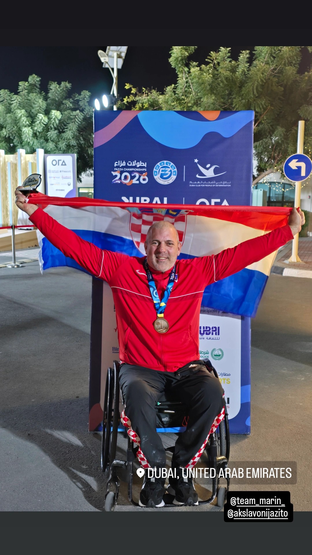Hrvatski paraatletičar Marin Županović ostvario je izvanredan uspjeh na natjecanju u Dubaiju, gdje je u disciplini bacanja diska (kategorija F54/55) čak pet puta popravljao vlastiti rekord i na kraju zasluženo osvojio brončanu medalju.