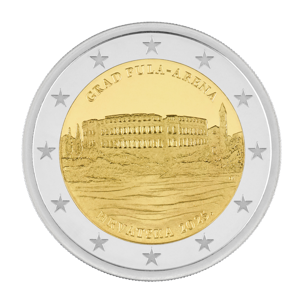 Nova prigodna kovanica od 2 eura donosi prikaz jednog od najpoznatijih hrvatskih i svjetskih antičkih spomenika – pulske Arene, simbola bogate kulturne i povijesne baštine Republike Hrvatske. Motiv Arene već je ranije bio korišten i na naličju novčanice od 10 kuna, čime se dodatno potvrđuje njezina važnost u hrvatskoj kulturnoj ikonografiji.