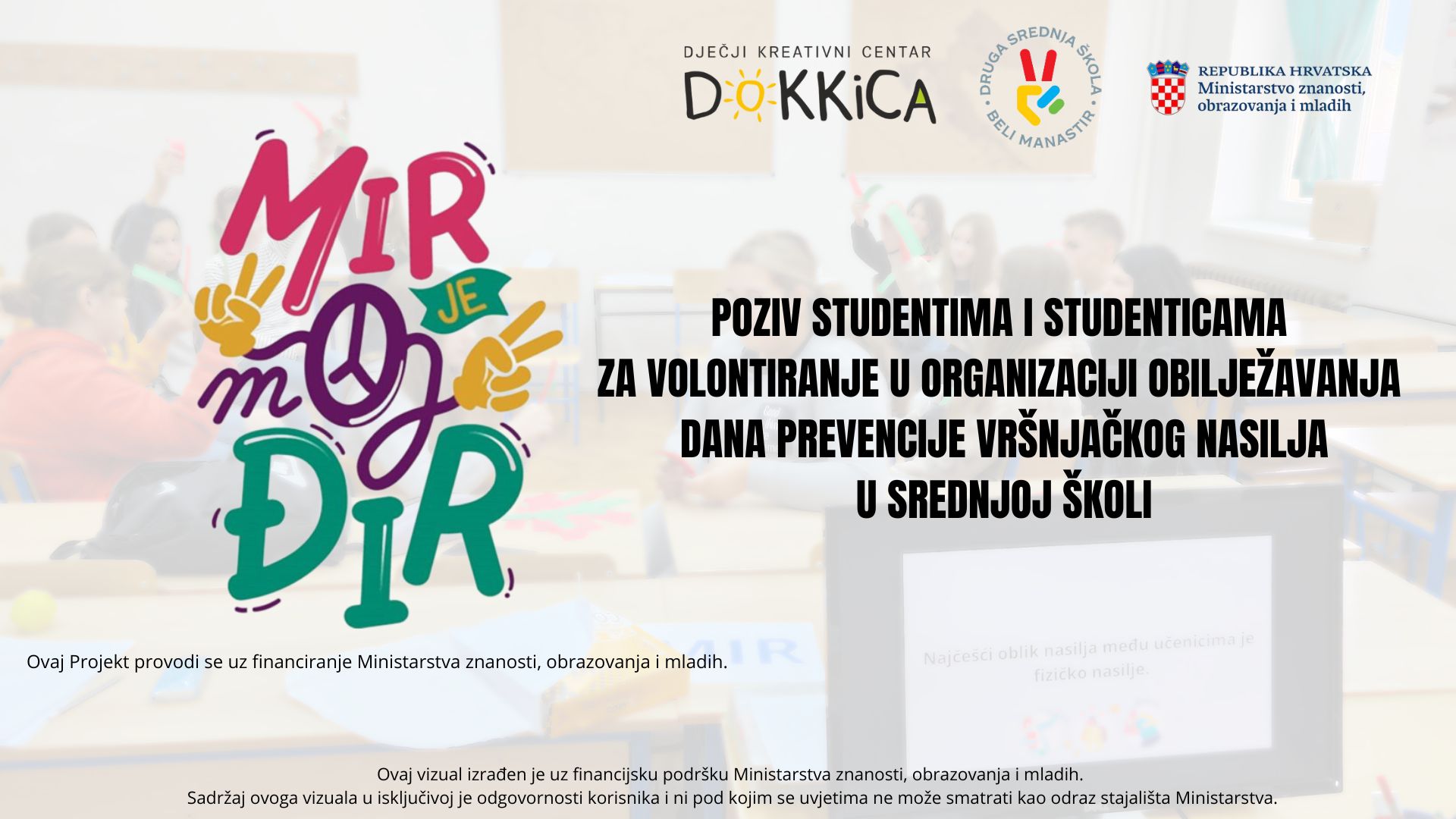 Projekt udruge Dokkica pod nazivom “Mir je moj đir” je došao do završne faze koja je rezultirala brojnim dječjim ambasadorima mira u osječkim osnovnim školama. Naime, ovaj se projekt provodio u sklopu natječaja Nacionalne zaklade za razvoj civilnog društva “Izvaninstitucionalni odgoj i obrazovanje – Škola u zajednici s nultom tolarencijom za govor mržnje i nasilje”, a cilj projekta bio je osnažiti učenike/dječje ambasadore mira za stjecanje znanja i vještina za provedbu radionica nenasilne komunikacije i mirnog rješavanja sukoba te provedbu edukativne kampanje.
