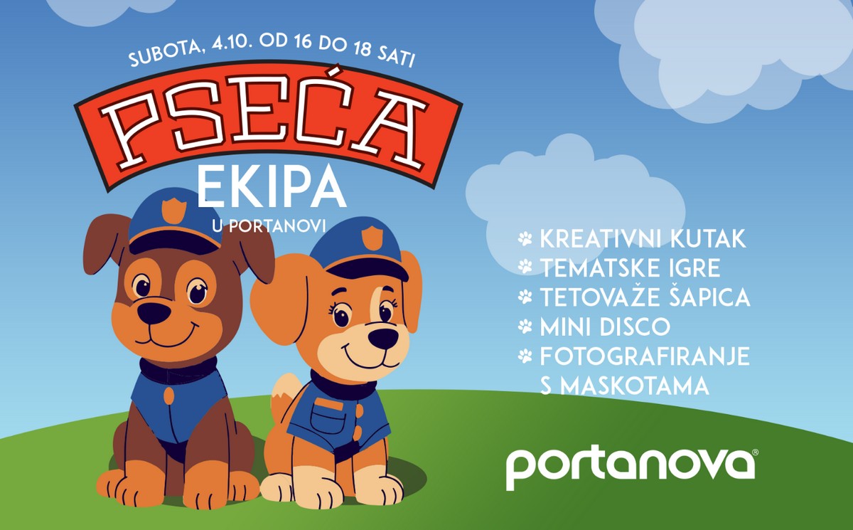 Pseća ekipa ovaj vikend stiže u Portanovu! Za kraj tjedna – u subotu, 4. listopada Portanova je pripremila i nešto za mališane: poznata pseća ekipa stiže u Portanovu! Najmlađe očekuje program koji će oduševiti baš svakog: kreativni kutak, tematske igre, tetovaže šapica, fotografiranje s maskotama i još puno toga! Ovo je prilika da se vaši klinci druže, zaplešu i nasmiju u društvu veselih junaka, dok vi uživate u opuštenom shoppingu ili zajedničkom obiteljskom druženju. Lokacija je na 1. katu, ispred Müllera, a ulaz je besplatan. Vidimo se u subotu od 16 sati!