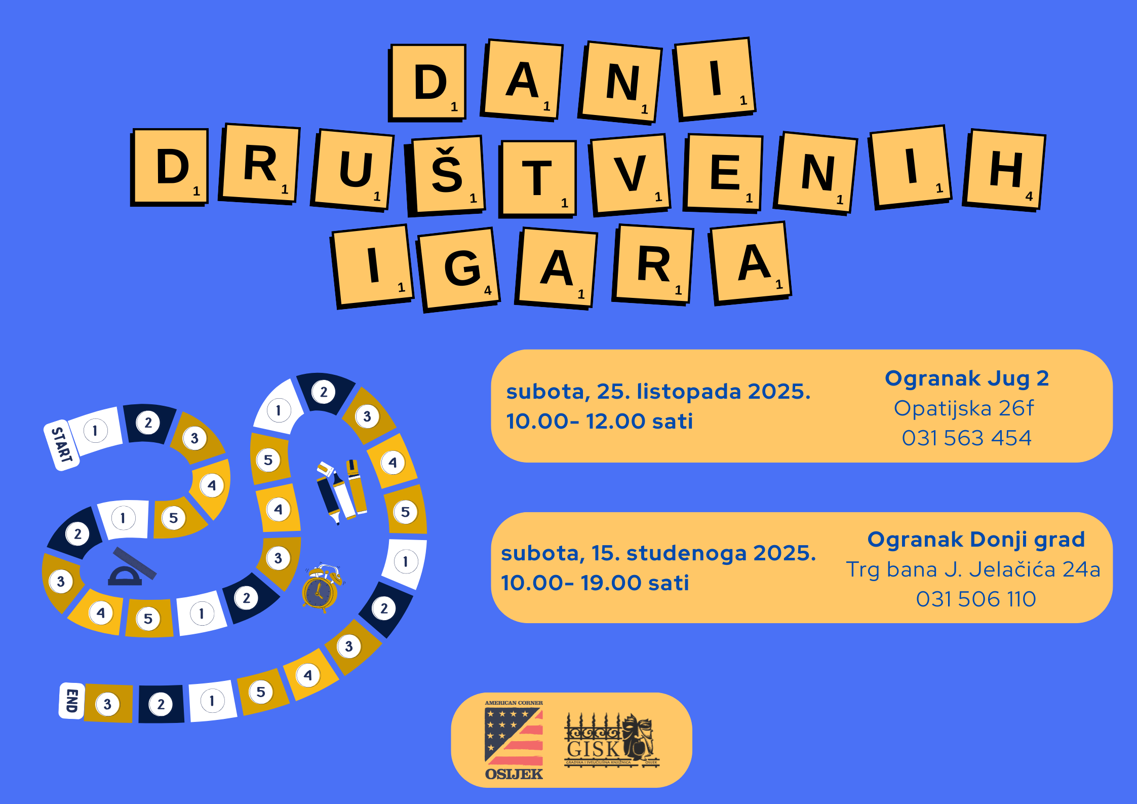 American Corner Osijek i Odjel za rad s djecom i mladima Gradske i sveučilišne knjižnice Osijek, tijekom Mjeseca hrvatske knjige, organiziraju radionice 3D olovaka i Dane društvenih igara.