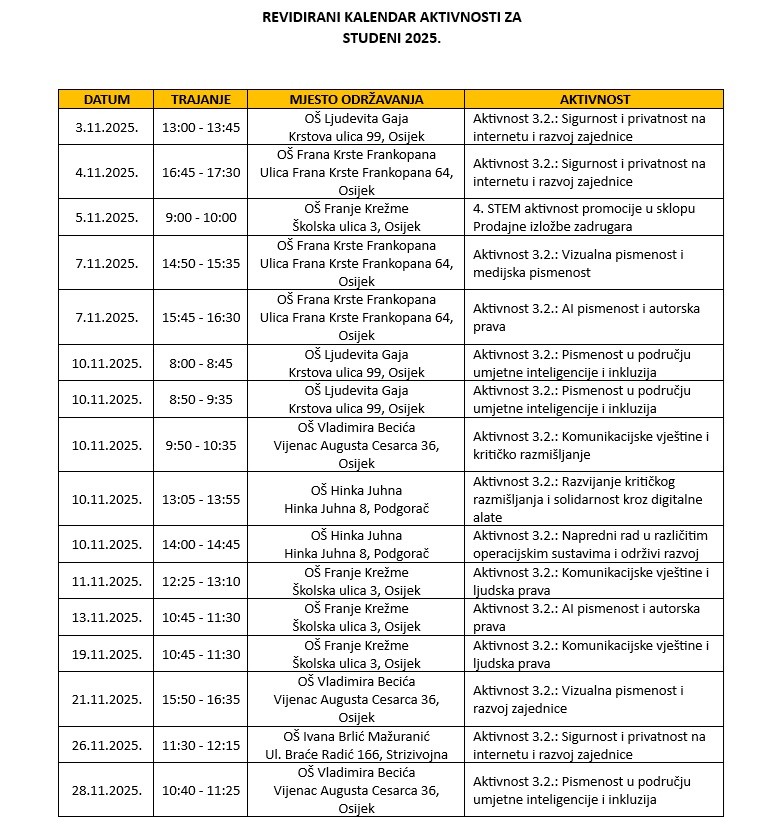 U kalendaru je uklonjena radionica u OŠ Ivana Brlić Mažuranić Strizivojna 24. studenog u 13:40-14:25. Izmjenjeni raspored radionica nalazi se u kalendaru aktivnosti.