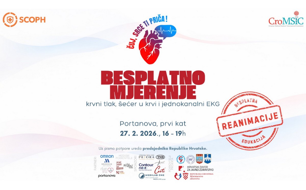 U petak, 27. veljače 2026., od 16 do 19 sati, na 1. katu ispred Müllera održat će se javnozdravstveni projekt „Čuj, srce ti priča!“ u organizaciji CroMSIC – Odbora za javno zdravstvo udruge studenata medicine. Povodom Svjetskog dana pulsa posjetitelji će moći besplatno snimiti EKG, izmjeriti krvni tlak i razinu šećera u krvi, analizirati sastav tijela te sudjelovati u edukaciji o osnovnim postupcima reanimacije uz stručno vodstvo. Bez najave, bez čekanja i potpuno besplatno – mali podsjetnik koliko je važno zastati i poslušati što nam srce poručuje.