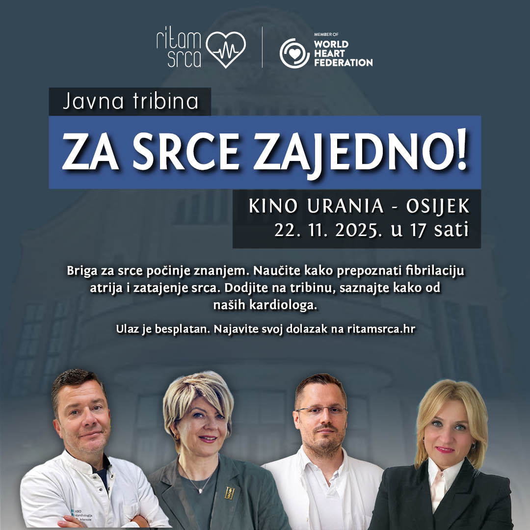 Hrvatska udruga za aritmije Ritam srca organizira javnu tribinu pod nazivom „Za srce zajedno“, koja će se održati u subotu, 22. studenoga 2025. u 17 sati u Kinu Urania.