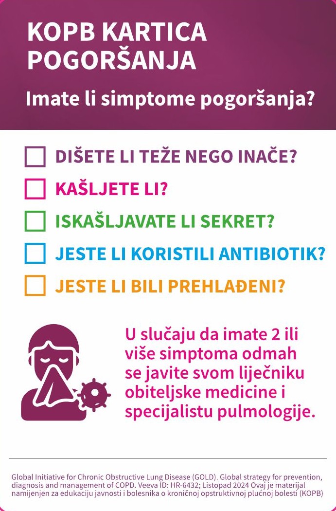Povodom Svjetskog dana kronične opstruktivne plućne bolesti (KOPB), timovi zdravstvenih stručnjaka diljem Hrvatske — pulmolozi, liječnici obiteljske medicine, medicinske sestre, respiratorni fizioterapeuti, ljekarnici i mladi studenti biomedicine provode prigodnu kampanju ranog otkrivanja rizičnih pacijenata i edukacije građana pod sloganom „Zaduha? Pomisli na KOPB!“