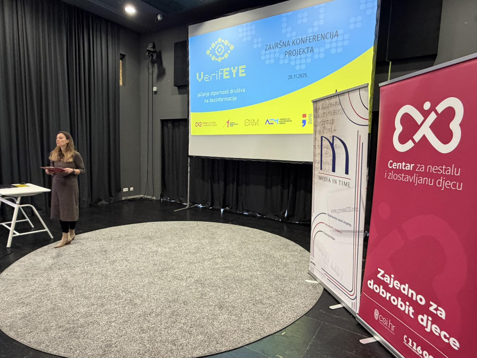 U petak, 28. studenoga 2025., u Kulturnom centru Osijek održana je završna konferencija projekta VerifEye – jačanje otpornosti društva na dezinformacije, u sklopu kojega je građanima omogućena prijava sumnjivih vijesti, a mladim fact-checkerima pružen strukturirani prostor za provjeru informacija. Projekt je provodio Centar za nestalu i zlostavljanu djecu u partnerstvu s Akademijom za umjetnost i kulturu u Osijeku te Centrom za kulturu medija Vinkovci, uz financiranje Agencije za elektroničke medije.