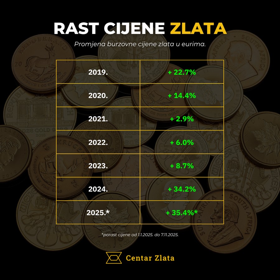 Samo u proteklih 12 mjeseci, cijena zlata porasla je za više od 35%. To je trinaest puta više od prinosa na ovogodišnje trezorske zapise, a mnogi analitičari očekuju nastavak rasta cijene i u godinama pred nama zbog nastavka visoke inflacije, geopolitičkih napetosti i potencijalnog dolaska nove recesije.